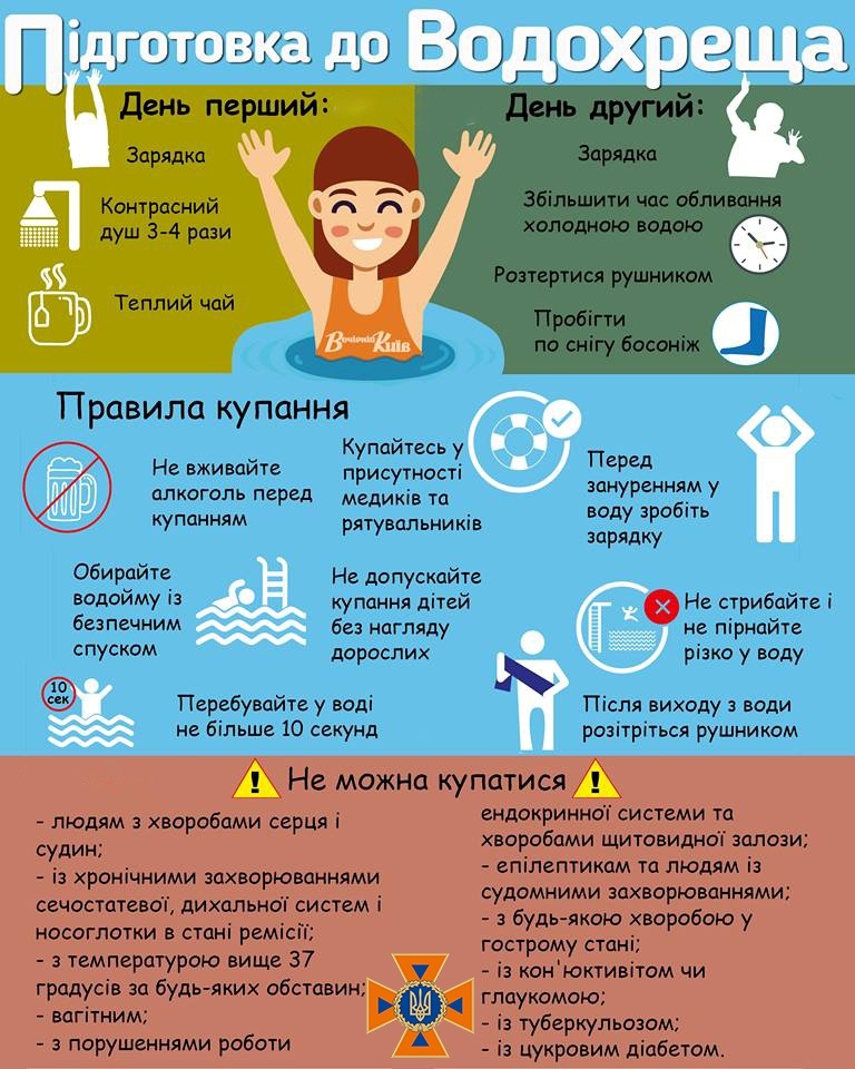Обов’язкова умова перед зануренням у воду – енергійна розминка. Не варто застрибувати у воду одразу: спочатку намочіть обличчя, груди, живіт та спину і лише після цього занурюйтесь по шию. Не варто пірнати з головою, адже це може призвести до різкого охолодження організму.