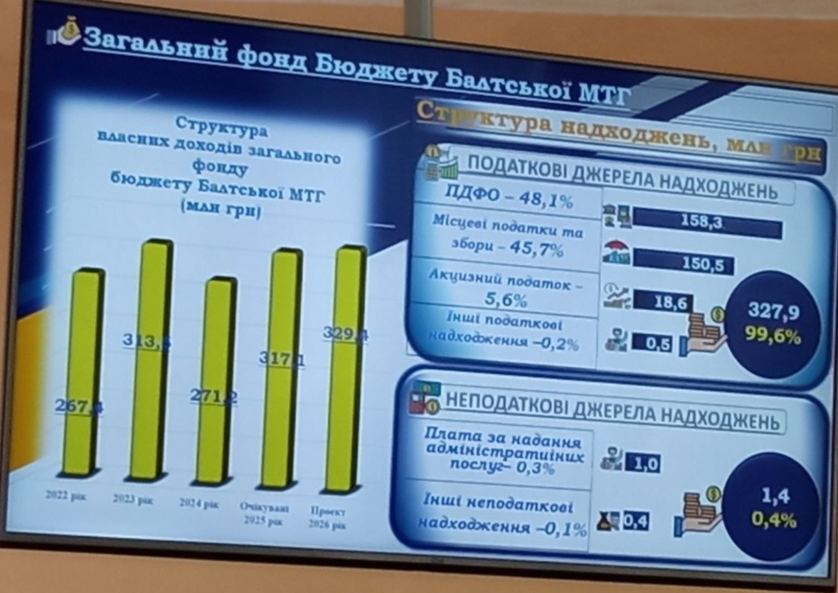 За її словами, прогноз доходів бюджету Балтської громади на 2026 рік становить 363 млн 472 тис. 720 грн. З цієї суми: