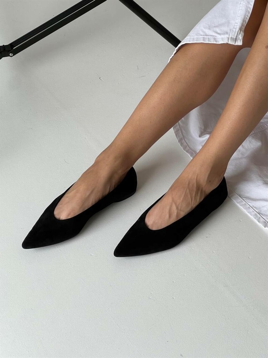 Замша додає об'єму завдяки текстурі. Замшеві балетки з гострим носком виглядають м'якше і менш графічно порівняно зі шкіряними. Це робить їх універсальнішими для повсякденного носіння.