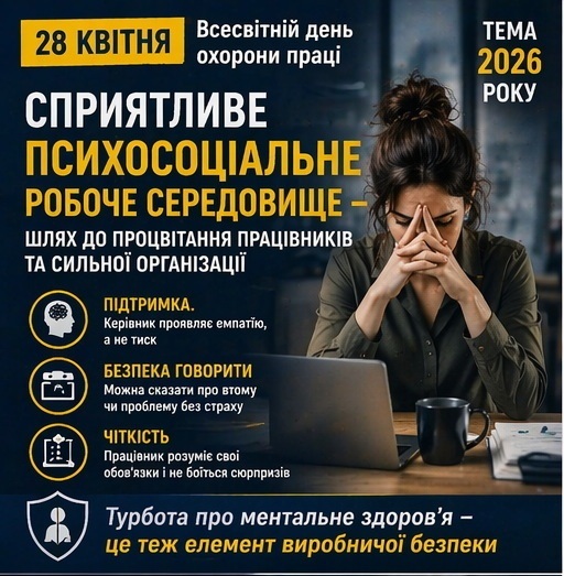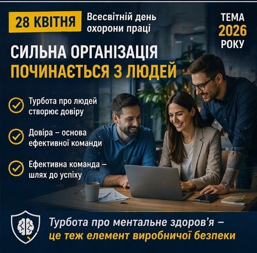 28 квітня у світі відзначають Всесвітній день охорони праці, започаткований у 2003 році за рішенням Міжнародна організація праці. В Україні цього дня також традиційно відзначають День охорони праці – щоб привернути увагу суспільства, роботодавців і держави до безпеки працівників та запобігання нещасним випадкам і професійним захворюванням.