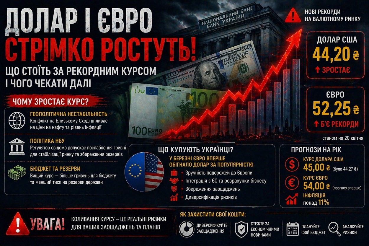 Євро встановлює все нові цінові рекорди, зростає і курс долара: станом на понеділок 20 квітня американська валюта в обмінниках сягнула 44,20 грн, євро перетнув позначку 52,25 грн. Коливання на валютному ринку нашої держави повʼязані зокрема, з геополітичною ситуацією. Так, одним з основних факторів здорожчання валюти є конфлікт на Близькому Сході. Адже від тамтешніх подій залежать ціни на нафту. А від вартості енергоресурсів – рівень інфляції та міцність долара чи євро.